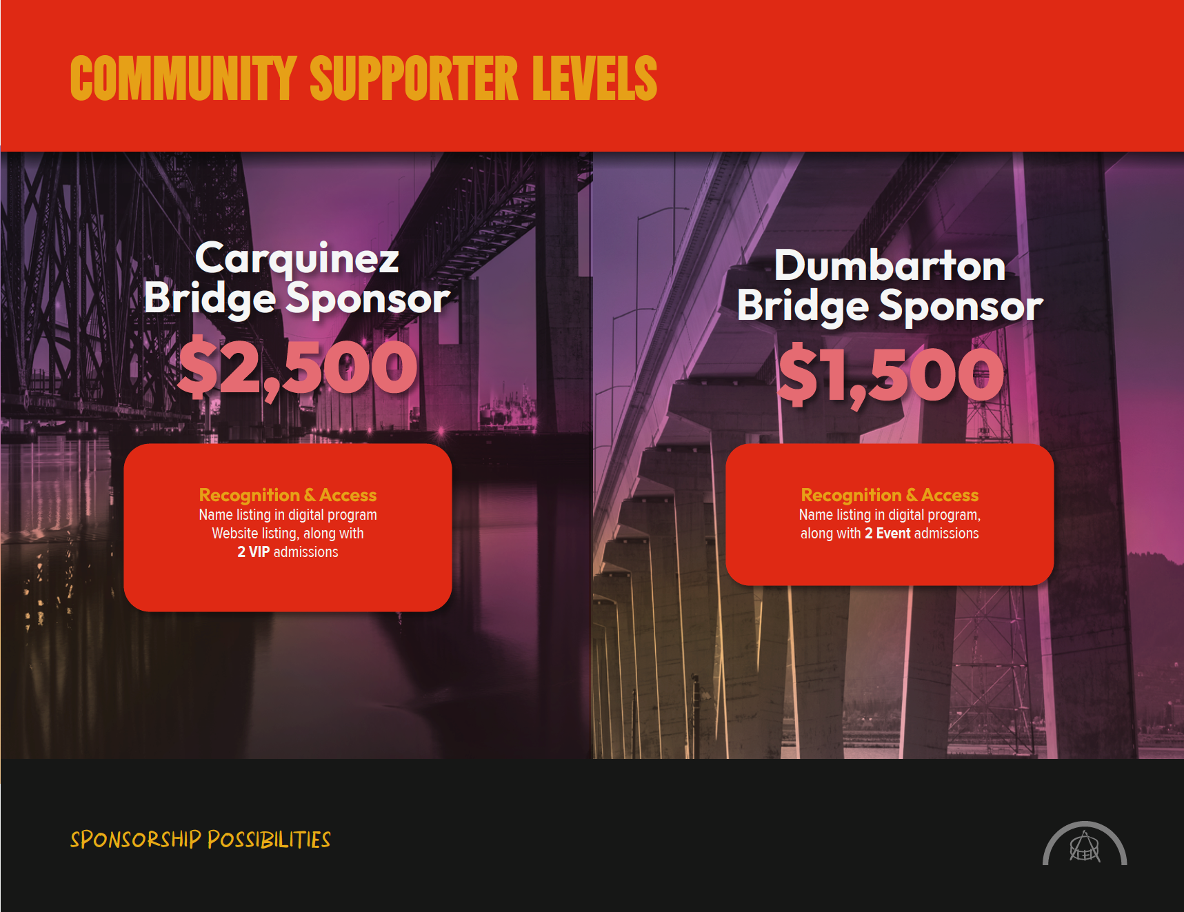 $75,000.00 Exclusive - Golden Gate - Presenting Sponsor (1 Available) $25,000.00 Bay Bridge - Lead Sponsor (3 Available) $10,000.00 Richmond / San Rafael Bridge Sponsor (8 Available) $5,000.00 San Mateo / Hayward Bridge Sponsor $2,500.00 Carquinez Bridge Sponsor $1,500.00 Dumbarton Bridge Sponsor Custom Amount Please enter an amount $ Support us by covering the fees we have to pay 3% Cover the Fee SPONSOR SPONSOR